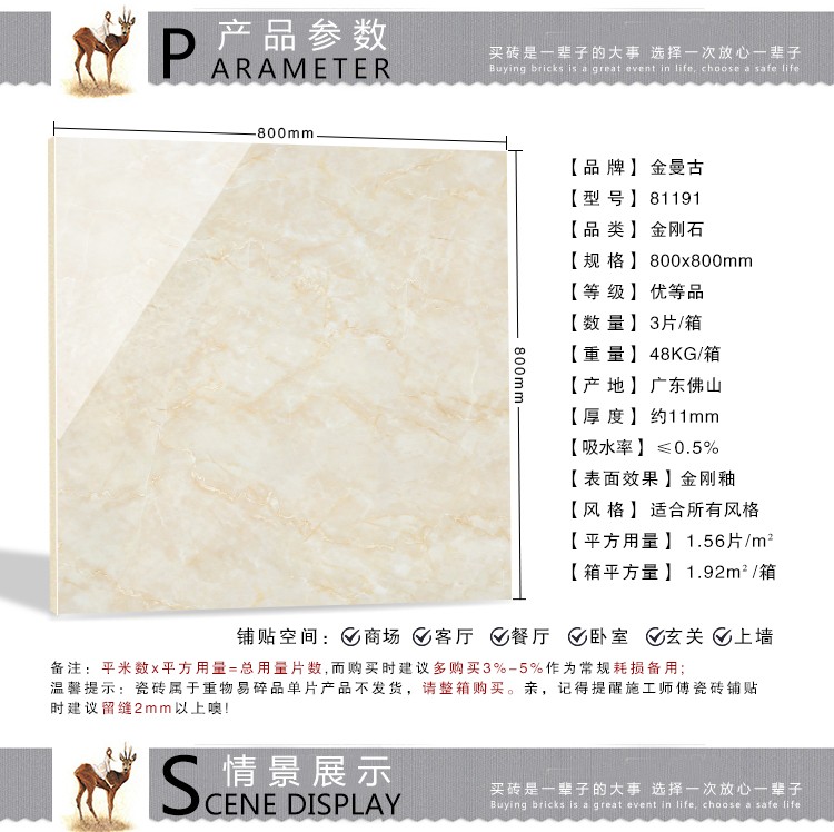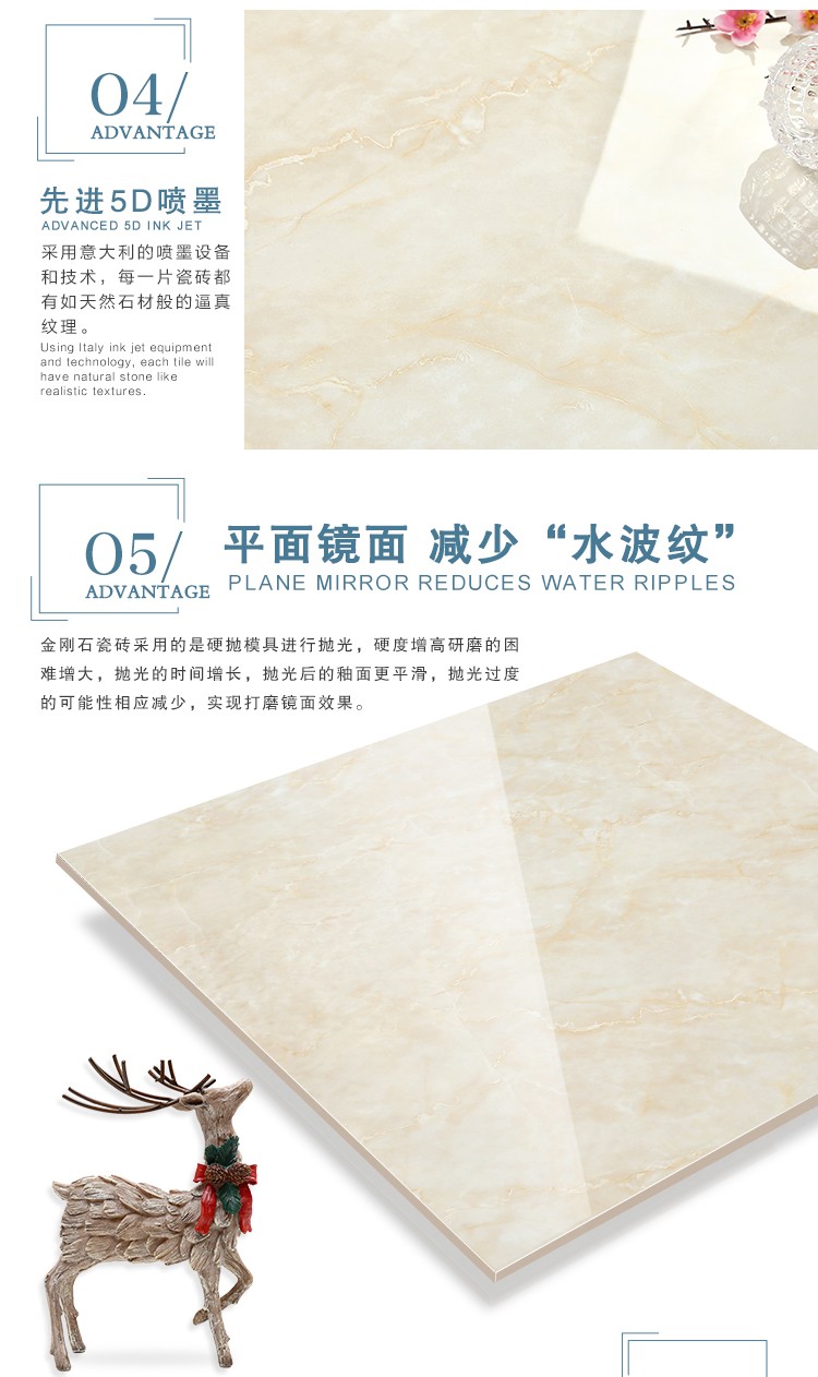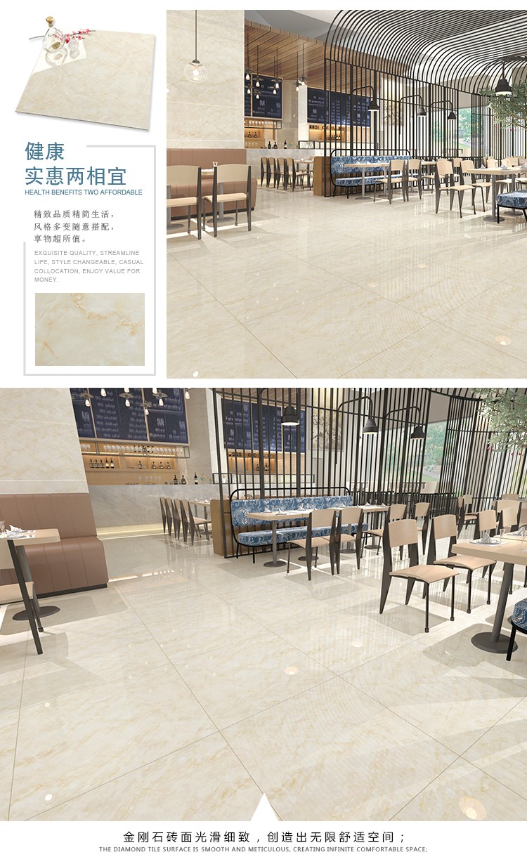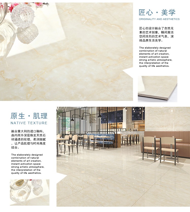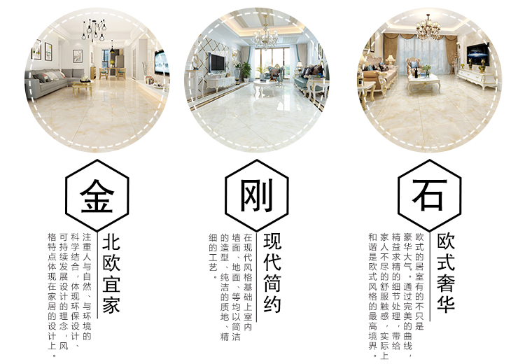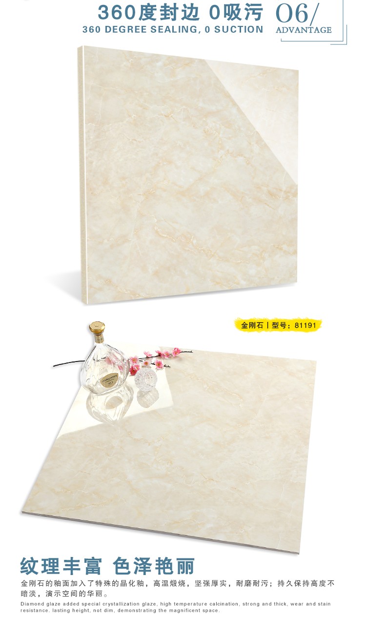 金曼古全拋釉瓷磚運用多層特殊制造工藝,將全透析釉料下彩技術結合先進印刷工藝,令花紋俯在下層,低碳能源、清潔生產,表面光潔剔透,獨有釉料精拋工序,集拋光磚與仿古磚優(yōu)點于一體,釉面如拋光磚般光滑亮潔,同時其釉面花色如仿古磚般圖案豐富,色彩厚重或絢麗。