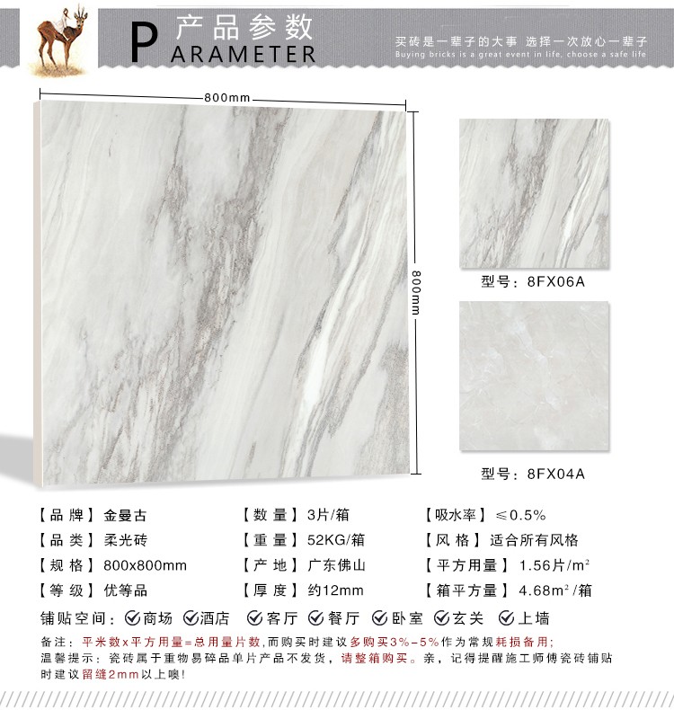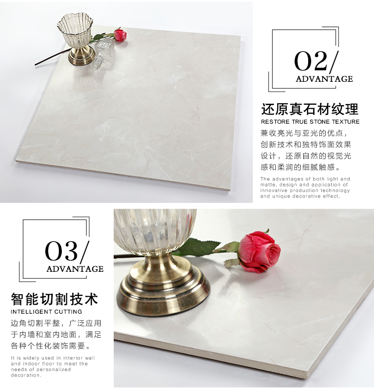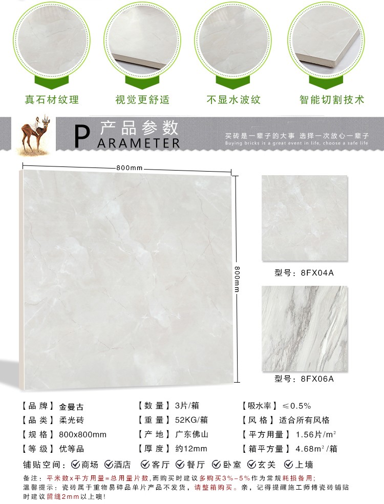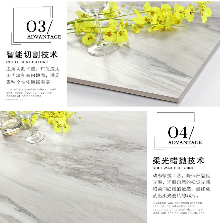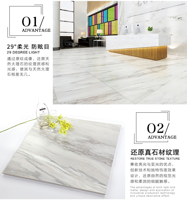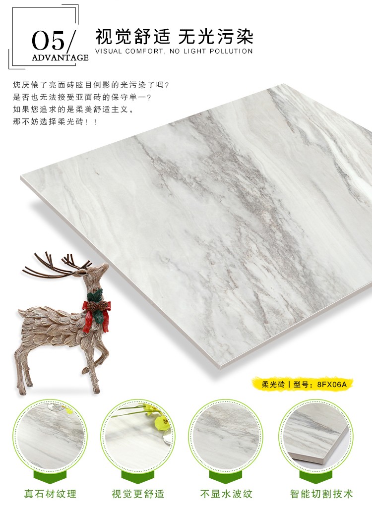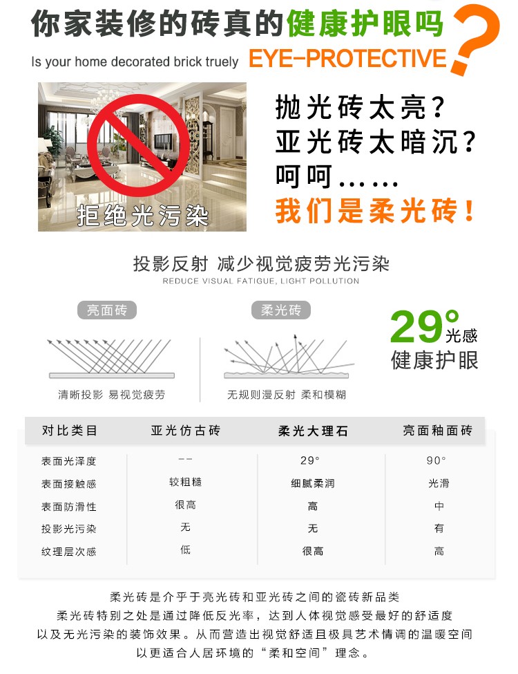 柔光瓷磚是磚面反射介于強(qiáng)光與弱光之間的一類瓷磚,其結(jié)合亮光類瓷磚的高調(diào)明艷裝飾和啞光類瓷磚的低調(diào)內(nèi)斂搭配效果,通過動(dòng)態(tài)柔光蠟拋技術(shù),降低產(chǎn)品反光率,從而達(dá)到人體舒適的視覺感受以及無光污染的空間裝飾效果。優(yōu)點(diǎn):1.視覺舒適,無光污染 2.堅(jiān)固耐磨,不易刮花.